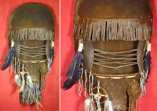 A012 - Saddle Tan Leather Cradleboard - Artist: Ken & Debra Smith; 405-278 - Description: This is a beautiful example of craftsmanship. This leather cradleboard was used by Native Americans to carry their children around while they worked. The cradleboard has beautiful fringe work, which is accentuated with black feathers. There is also a medicine bag and a dream catcher located near the bottom to keep the child safe. The loop, to which it would hang from the wall is also made out of leather and is braided. The cradleboard measures 24" long, 13" wide and has a depth of 9". This Native American creation comes with a Certificate of Authenticity.