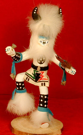 K514 - Navajo 6" Buffalo Kachina - Artist: Largo - Description: The Buffalo Warrior Kachina is second to the most powerful warrior amongst the Kachinas. He is the Kachina who can kill any evil thoughts and is the great spiritual protector. This Tribal Kachina is exquisitely detailed with emphasis on the face and hands. It is posed in action and measures 6" tall. This Kachina is clothed in hand painted suede and fur. It is securely attached to the base with wooden pegs, making it extremely sturdy. This Native American creation comes with a Certificate of Authenticity.